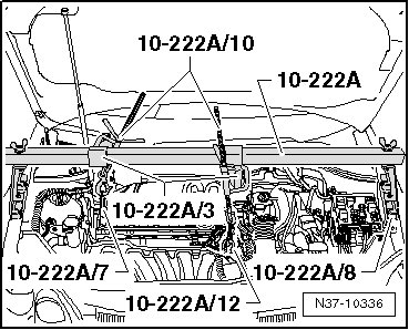 - Turn the left spindle on the engine support bridge (10-222 A) and slightly lower the engine and transmission.