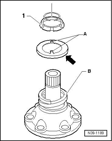 - Install the thrust washer union so that it engages into the groove - B - of the differential housing.