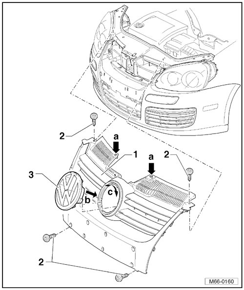 • Installing: Guide manufacturer's emblem with catch into recesses in radiator grille - arrow b -, then twist slightly in direction - arrow c - until manufacturer's emblem engages in radiator grille.