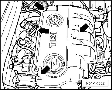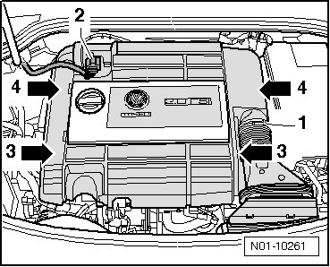 - Disengage engine cover at the retaining points - arrows - and remove engine cover upward.