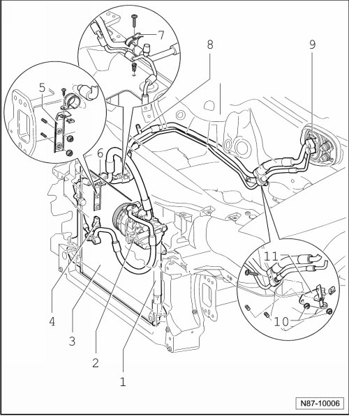 • Pay attention to notes for installing A/C compressor => [ A/C Compressor, Installation Information ] A/C Compressor, Installation Information.