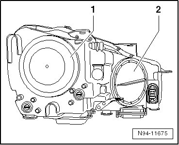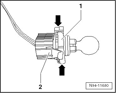 - Press the locking mechanism - arrows - and remove the right front turn signal bulb - 1 - from the bulb socket - 2 -.