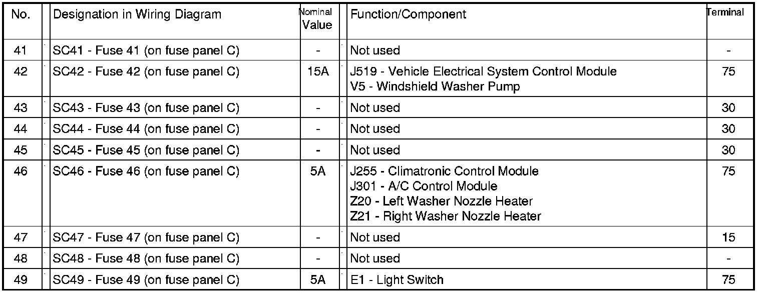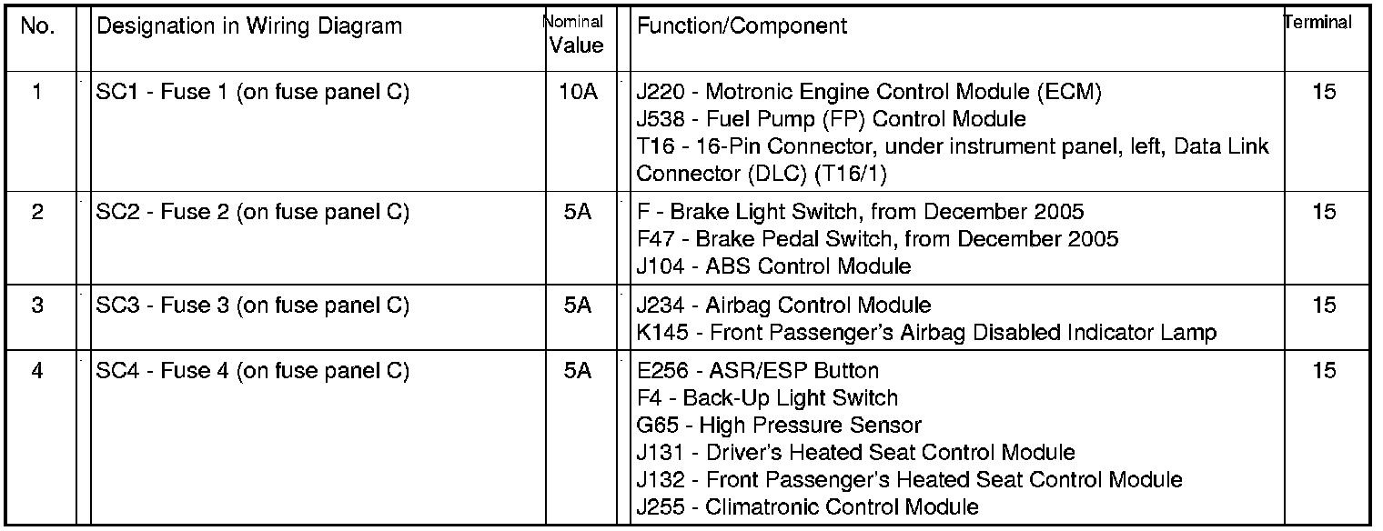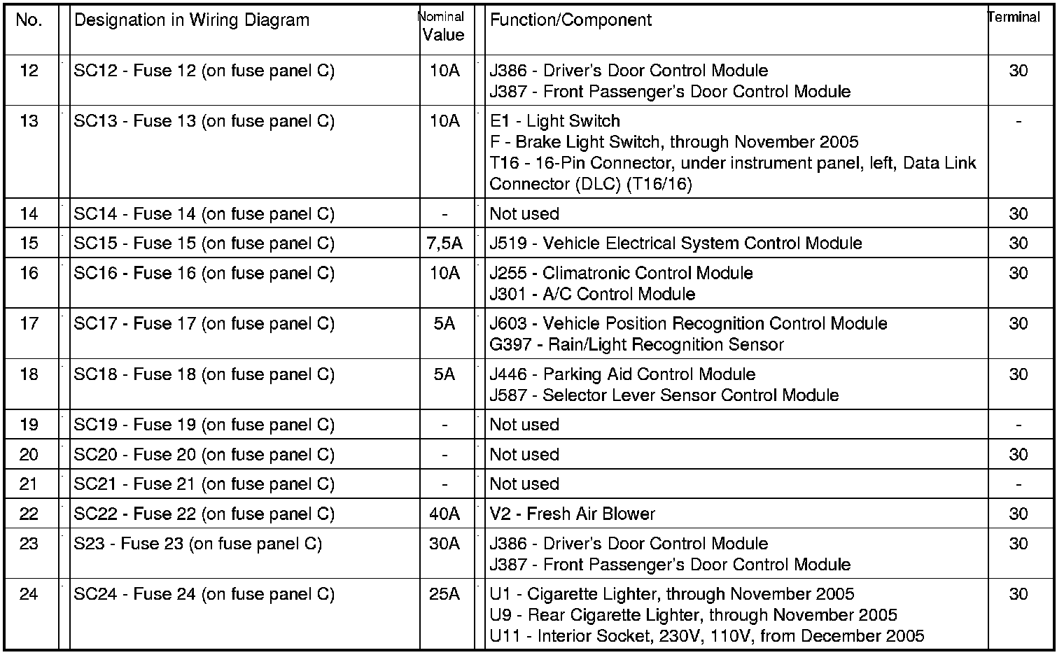 Fuses (SC) on fuse panel C (electronics box High), from May 2005