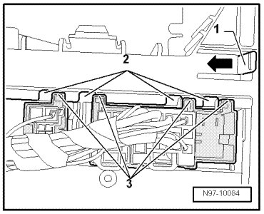 - Pull the tab - 1 - on the bracket for the comfort system central control module in - direction of arrow - and slide the comfort system central control module until the holes - 2 - lines up over the holes - 3 -.