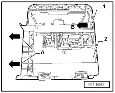 - Pull the tab - 1 - in - direction of arrow B - and slide the comfort system central control module - 2 - out of the bracket in - direction of arrow A -.