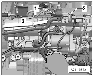 - Disconnect the connector - 1 - and the ventilation hose - 3 - from the EVAP canister purge regulator valve 1 - 2 -.
