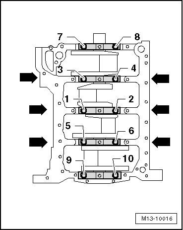 Tighten the crankshaft bearing cap bolts in sequence - 1 through 10 -: