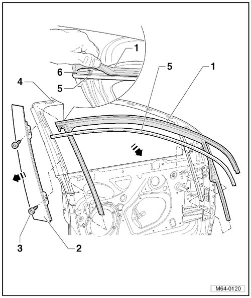 - Remove the trim molding - 5 - from the window guide - 1 - in the - direction of the arrow -.