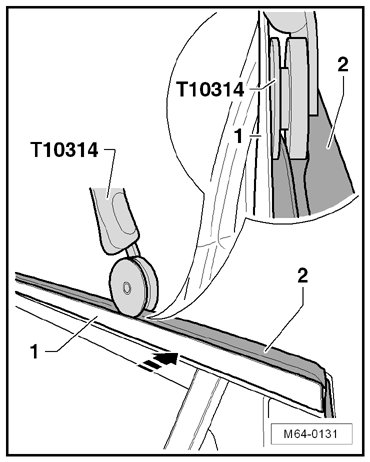 - Then press the window guide - 2 - correctly onto the trim molding mount - 1 - using the Roller (T 10314).