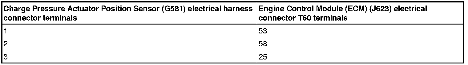 - Using a multimeter, check the Charge Pressure Actuator Position Sensor (G581) electrical harness connector terminals to the Engine Control Module (ECM) (J623) electrical harness connector T60 terminals for an open circuit. Refer to Wiring Diagrams for Pin locations.