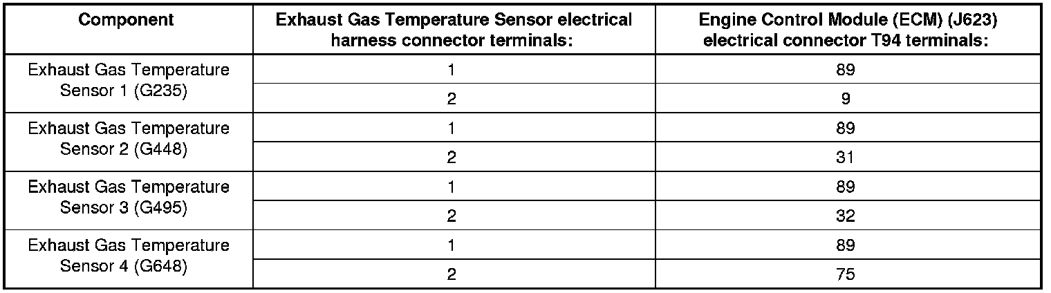 - Using a multimeter, check the Exhaust Gas Temperature Sensor electrical harness connector terminals to the Engine Control Module (ECM) (J623) electrical harness connector T94 connector for resistance. Refer to Wiring Diagrams for Pin locations.