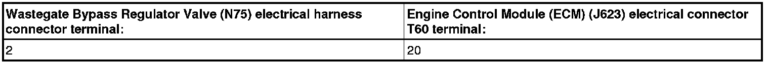 - Using a multimeter, check the Wastegate Bypass Regulator Valve (N75) electrical harness connector terminal to the Engine Control Module (ECM) (J623) electrical harness connector terminal for an open circuit.