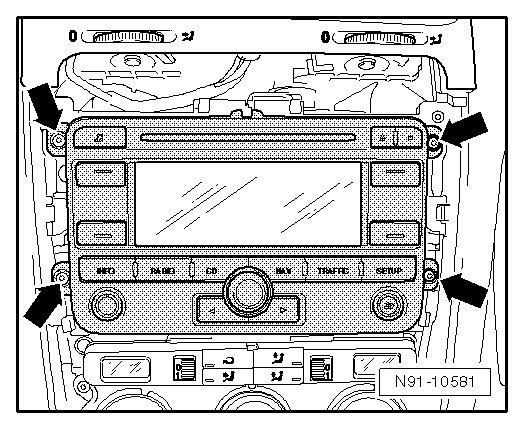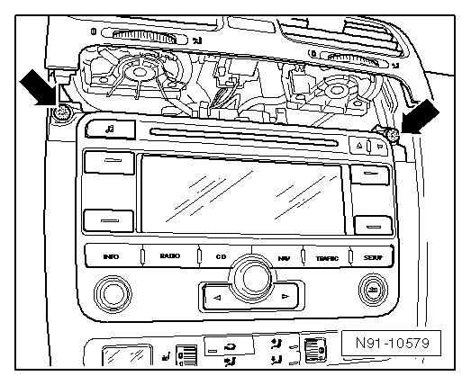 - Install the screws - arrows - in the radio/navigation display unit control module.