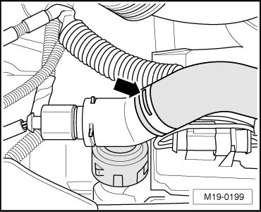 - Open the spring clamp - arrow - and disconnect the coolant hose.