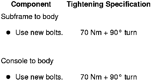 - Tighten subframe and brackets with new bolts on body to additional torque angle.