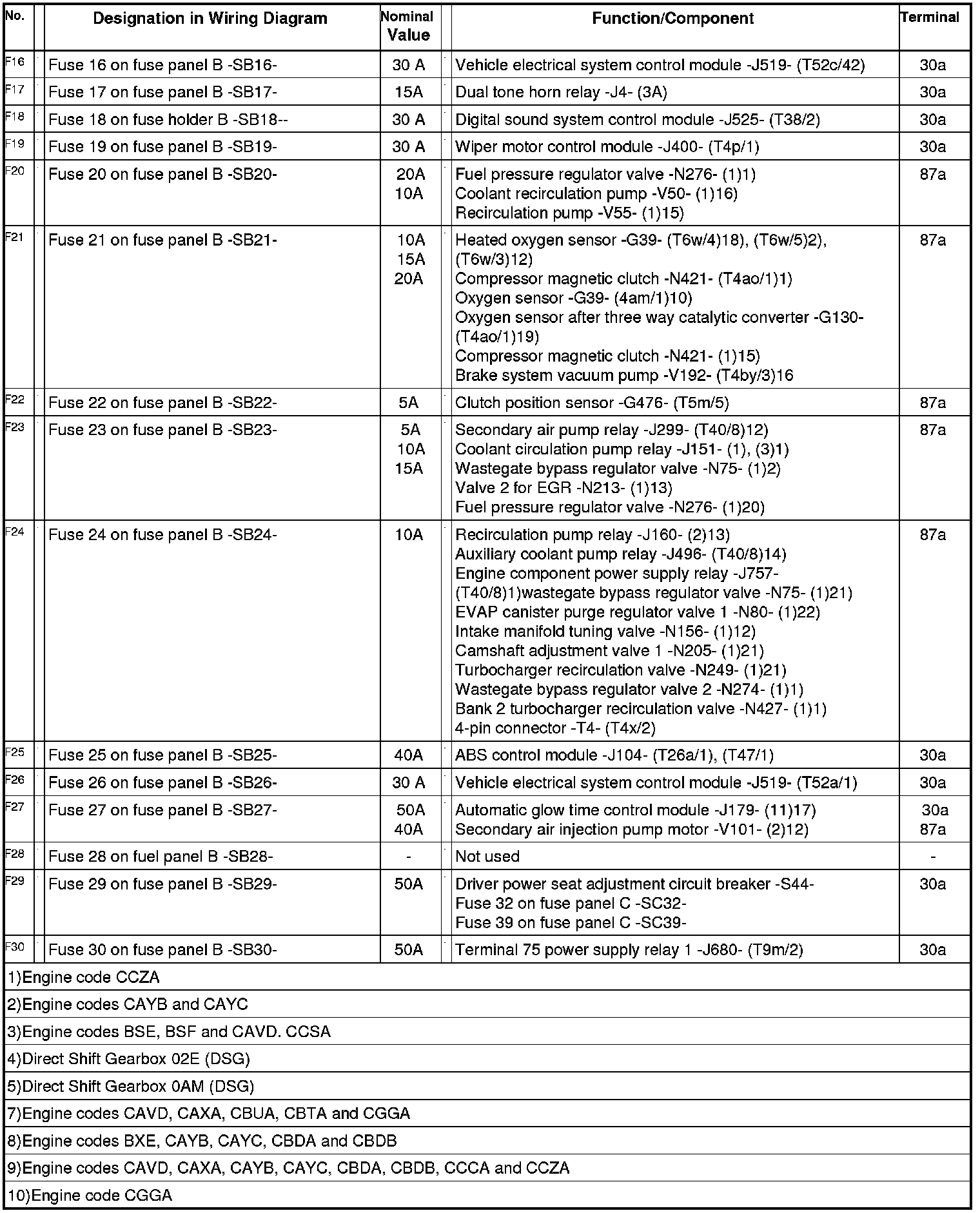 Fuse Assignment (SB) On Fuse Panel B, On The E-Box, From MY 10,