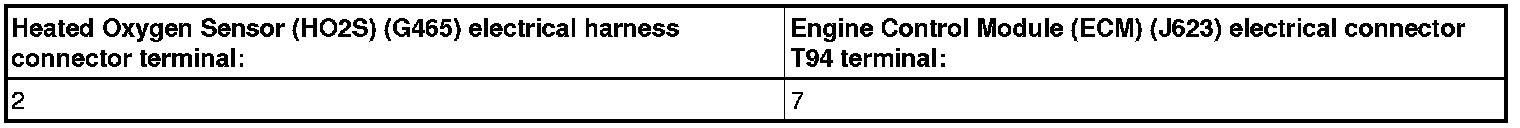 - Using a multimeter, check the Heated Oxygen Sensor (HO2S) (G465) electrical harness connector terminal 2 to the Engine Control Module (ECM) (J623) electrical harness connector T94 terminal for an open circuit. Refer to Wiring Diagrams for pin locations.