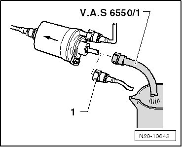 - Connect the pressure tester (VAS 6550) to the fuel supply line using the adapter (VAS 6550/1). Hold the other end of adapter (VAS 6550/2) in the measuring container.