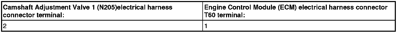 - Using a multimeter, Check the Camshaft Adjustment Valve 1 (N205) electrical harness connector terminal 2 to the Engine Control Module (ECM) electrical harness connector T60 for an open circuit. Refer to Wiring Diagrams for pin locations.