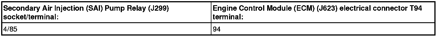 - Using a multimeter, check the Secondary Air Injection (SAI) Pump Relay (J299) socket 4 (relay terminal 85) to the Engine Control Module (ECM) (J623) electrical harness connector T94 for resistance. Refer to Wiring Diagrams for pin locations.