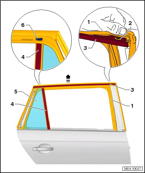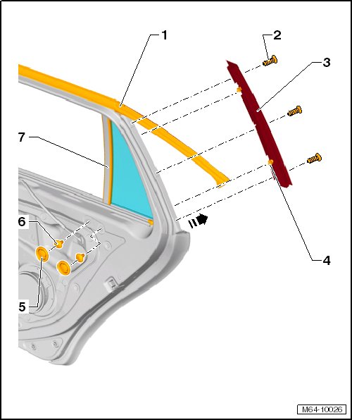 - Remove the entire window guide - 1 - with the fixed door window - 5 - and center brace - 4 - upward in the direction of the - arrow - out of the door.