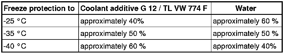 - If freeze protection is insufficient, drain off required quantity shown in freeze protection table and add coolant additive -G 12- which corresponds to TL VW 774 F.