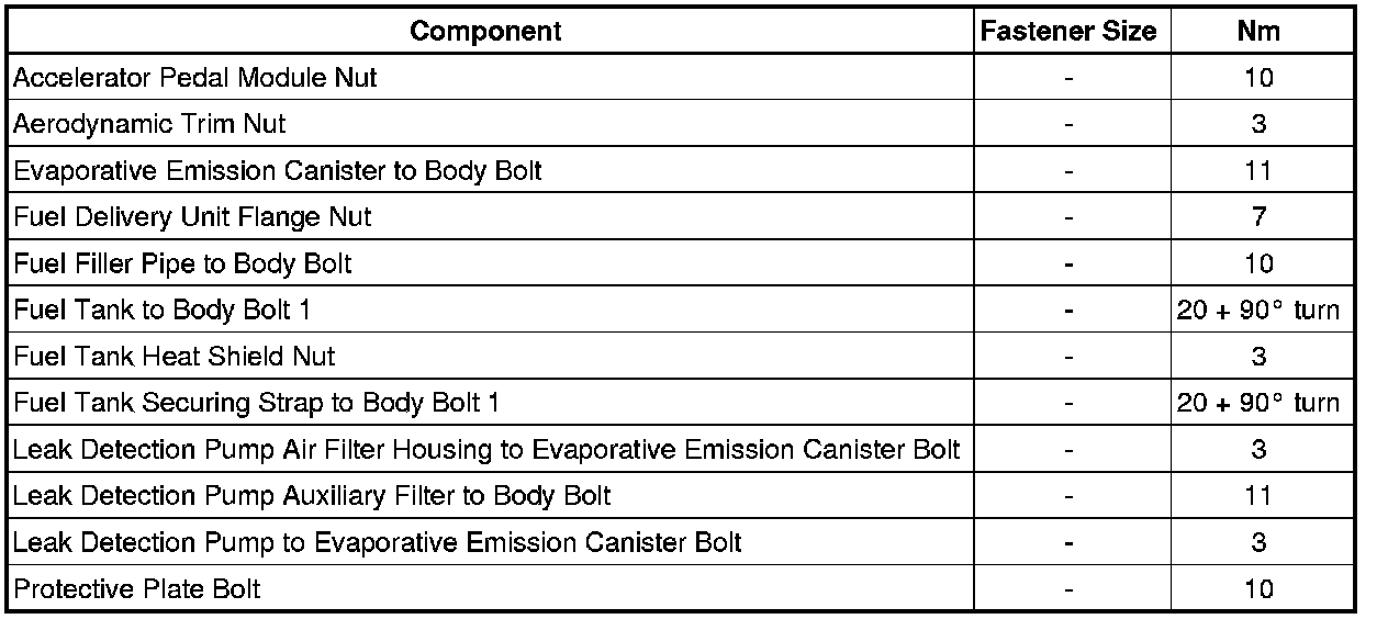 Fastener Tightening Specifications, Engine Code BPR (Metal Fuel Tank)