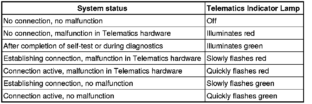 Depending on the status of the Telematics system, activation of the Telematics indicator lamp with the ignition switched on corresponds to the following table: