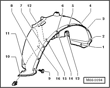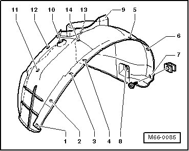 - Remove bolts - 3 -(14x) and nut- 2 - and remove wheel housing liner.