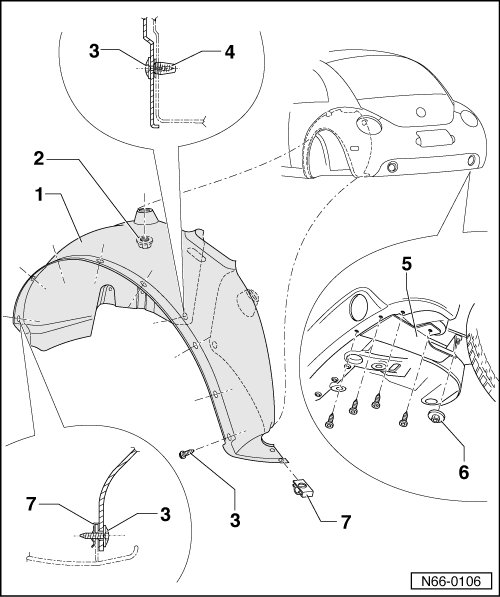 Depending on equipment, wheel housing liners differ slightly regarding position and number of securing elements.