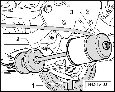 - Pull bonded rubber bushing out of rear axle using multi purpose tool (VW 771) - 2 - and thrust piece (3416/2) - 3 -.