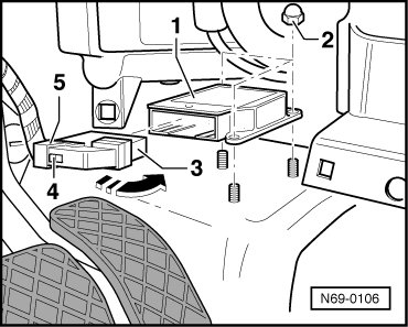 - Press retaining tabs - 4 - down, tilt bracket - 5 - - arrow - and pull harness connector - 3 - out of control module - 1 -.