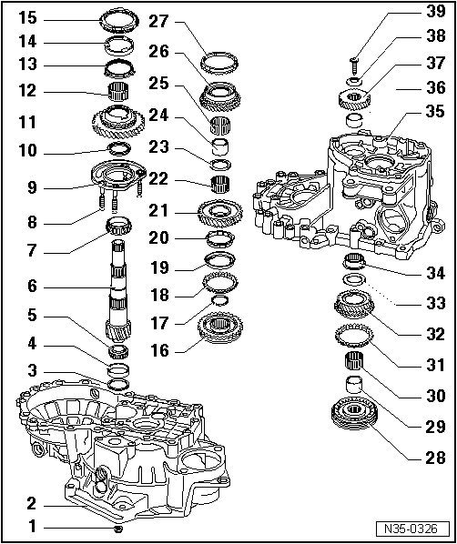 • When installing new drive gears or input shaft, observe => and technical data => [ Code Letters, Allocation, Ratios, Capacities ] Code Letters, Allocation, Ratios, Capacities.