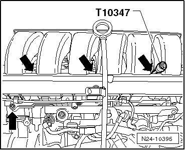 - Remove the intake manifold/cylinder head bolts - arrows - using (T10347).