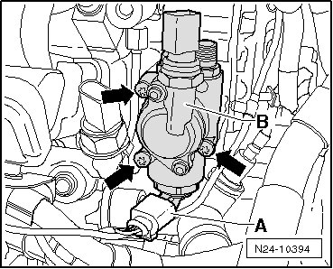 - Disconnect the connector - A -, remove the bolts - arrows - and remove the high pressure pump - B - from the engine.