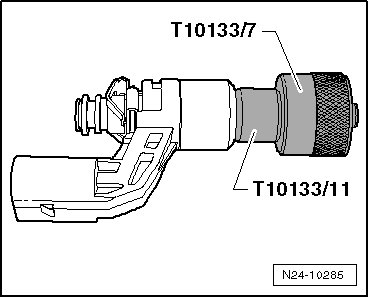 - Install the (T10133/5) and seal onto the fuel injector nozzle. Slide the seal onto the injector using (T10133/6).