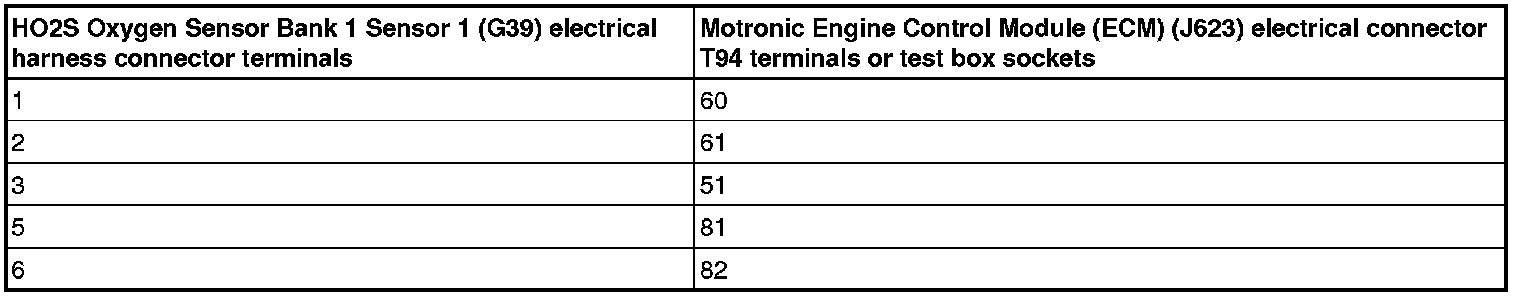 - Using a multimeter, check the HO2S Oxygen Sensor Bank 1 Sensor 1 (G39) electrical harness connector terminals to the Motronic Engine Control Module (ECM) (J220) electrical harness connector T94 terminals for an open circuit.