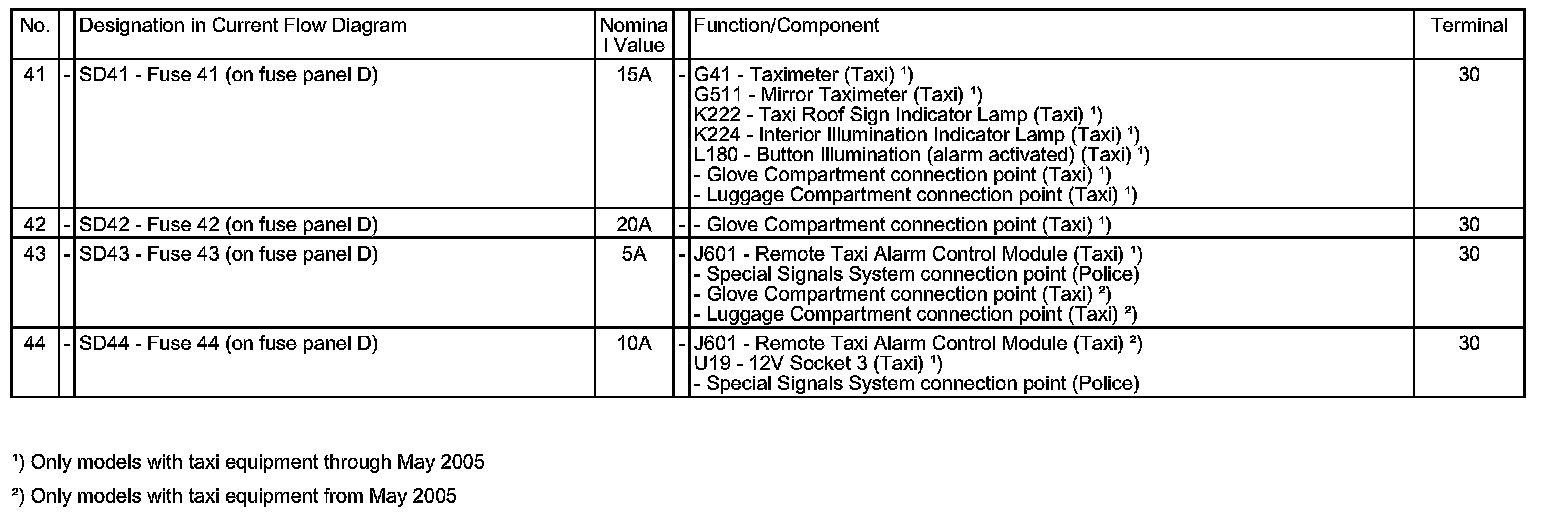 Fuse Arangements (On Fuse Panel D), Instrument Panel, Right Part 4: