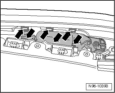 - Disengage retaining tabs - arrows - and remove door opener with Driver Interior Locking Button.