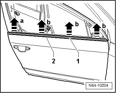 - Begin at rear window guide - arrow a - and carefully lift window recess seal - 1 -.