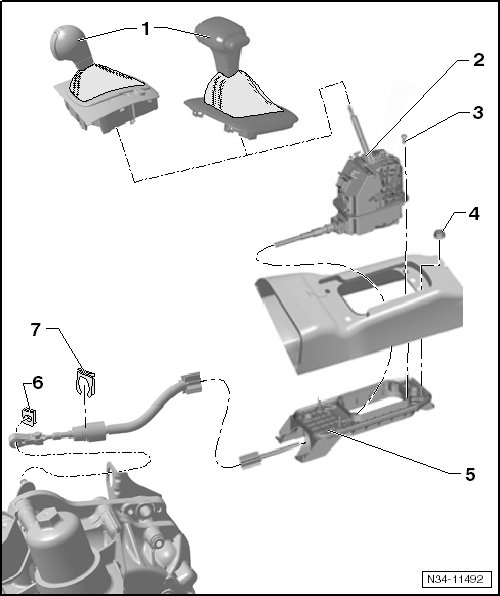 Removing and installing, refer to => [ Selector Lever and Mechanism with Cable, from 03.2009 ] Selector Lever and Mechanism With Cable, From 03.2009.