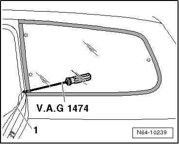 - Pull cutting cord - 1 - through adhesive sealant at place shown in picture into vehicle interior at lower area of rear window using (V.A.G 1474/2) from (V.A.G 1474 A).