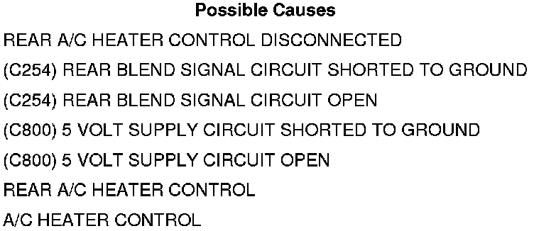 • Set Condition: If the A/C Heater Control detects a voltage less than 0.21 of a volt for 60 seconds on the Rear Blend Signal circuit. If a valid voltage is detected for two seconds the DTC will change from active to stored and stay in the controllers memory for 100 consecutive ignition cycles.