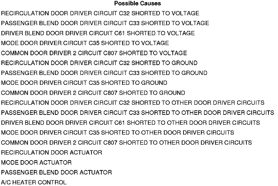 • Set Condition: If the A/C heater control detects a short to ground or to voltage on the recirculation door driver, the passenger blend door driver, the driver blend door driver, the mode door driver, or the common door driver 2 circuits while attempting to drive the passenger blend door driver.