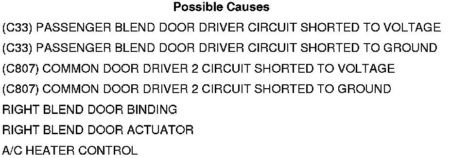 • Repair the (C33) Passenger Blend Door Driver circuit for a short to voltage.