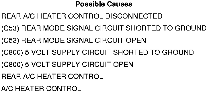 • Set Condition: If the A/C Heater Control detects a voltage less than 1.0 volt for five seconds on the Rear Mode Signal circuit. If a valid voltage is detected for one second the DTC will change from active to stored and stay in the controllers memory for 100 consecutive ignition cycles.
