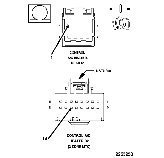 • Measure the resistance of the (C53) Rear Mode Signal circuit between A/C Heater Control C2 harness connector and the Rear A/C Heater Control C1 harness connector.