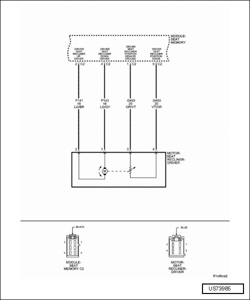 • Using a 12 volt test light connect one lead to the driver seat recliner up driver circuit and the other lead to driver seat recliner down driver circuit at the driver recliner seat adjuster motor harness connector.
