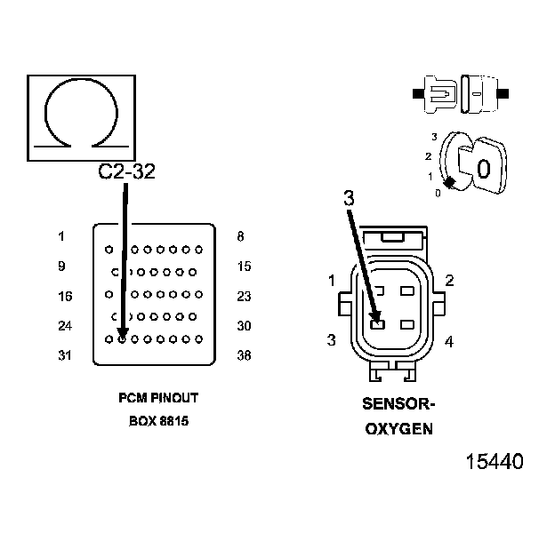 • Using the wiring diagram/schematic as a guide, inspect the wiring and connectors between the 2/1 oxygen sensor and the PCM.