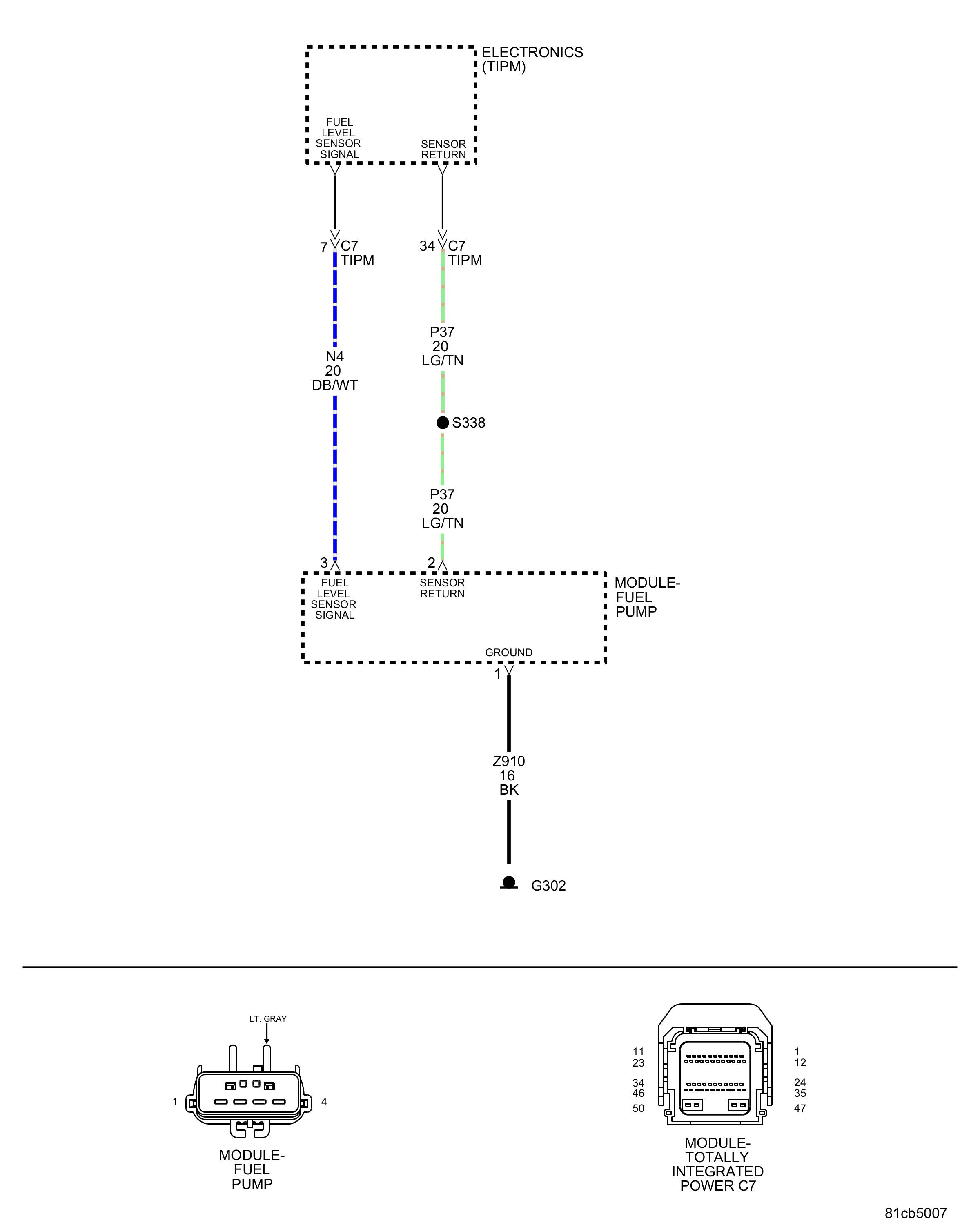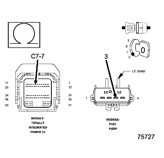 • Using the wiring diagram/schematic as a guide, inspect the wiring and connectors between the fuel level sensor 1 harness connector and the totally integrated power module.